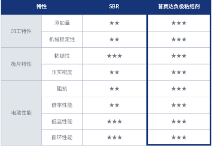針對負(fù)極材料的特性,惠州普賽達(dá)研發(fā)的負(fù)極粘結(jié)劑是丙烯酸酯共聚物乳液,有著40%固含和適當(dāng)?shù)漠a(chǎn)品粘度,其優(yōu)異的粘結(jié)性能使其添加量優(yōu)于日本最高技術(shù)水平的SBR產(chǎn)品;具有優(yōu)異的加工性能穩(wěn)定性好,且高速攪拌不易破乳;惠州普賽達(dá)負(fù)極粘結(jié)劑可針對客戶應(yīng)用場景,在合成共聚物中引入功能團(tuán),調(diào)整粘結(jié)劑Tg,改善低溫性能。