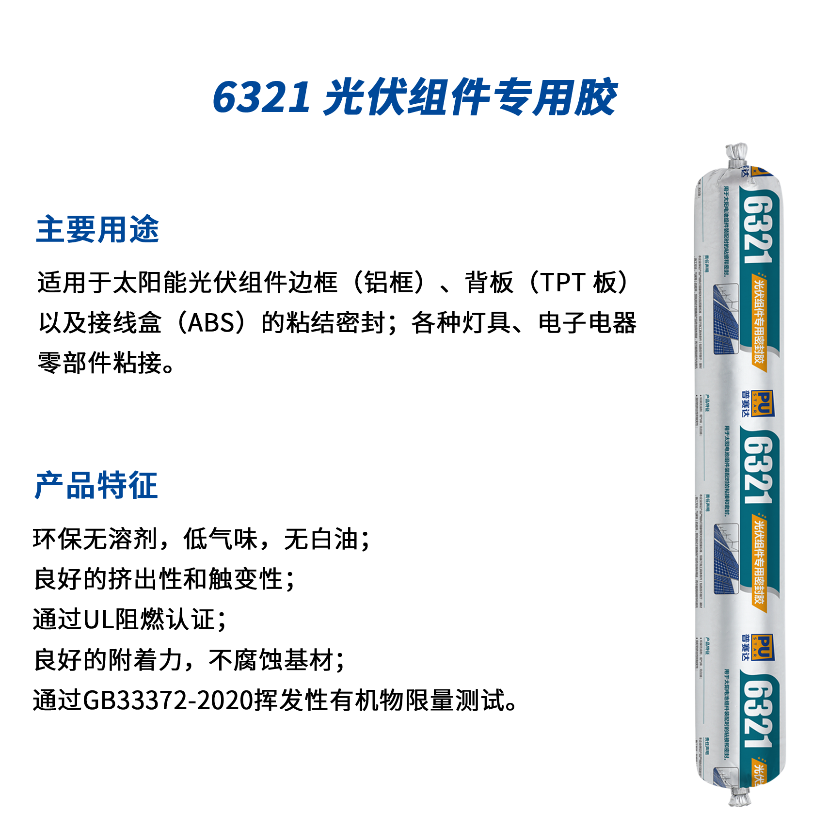 適用于太陽能光伏組件邊框(鋁框)、背板(TPT 板)以及接線 盒(ABS)的粘結(jié)密封;各種燈具、電子電器零部件粘接。