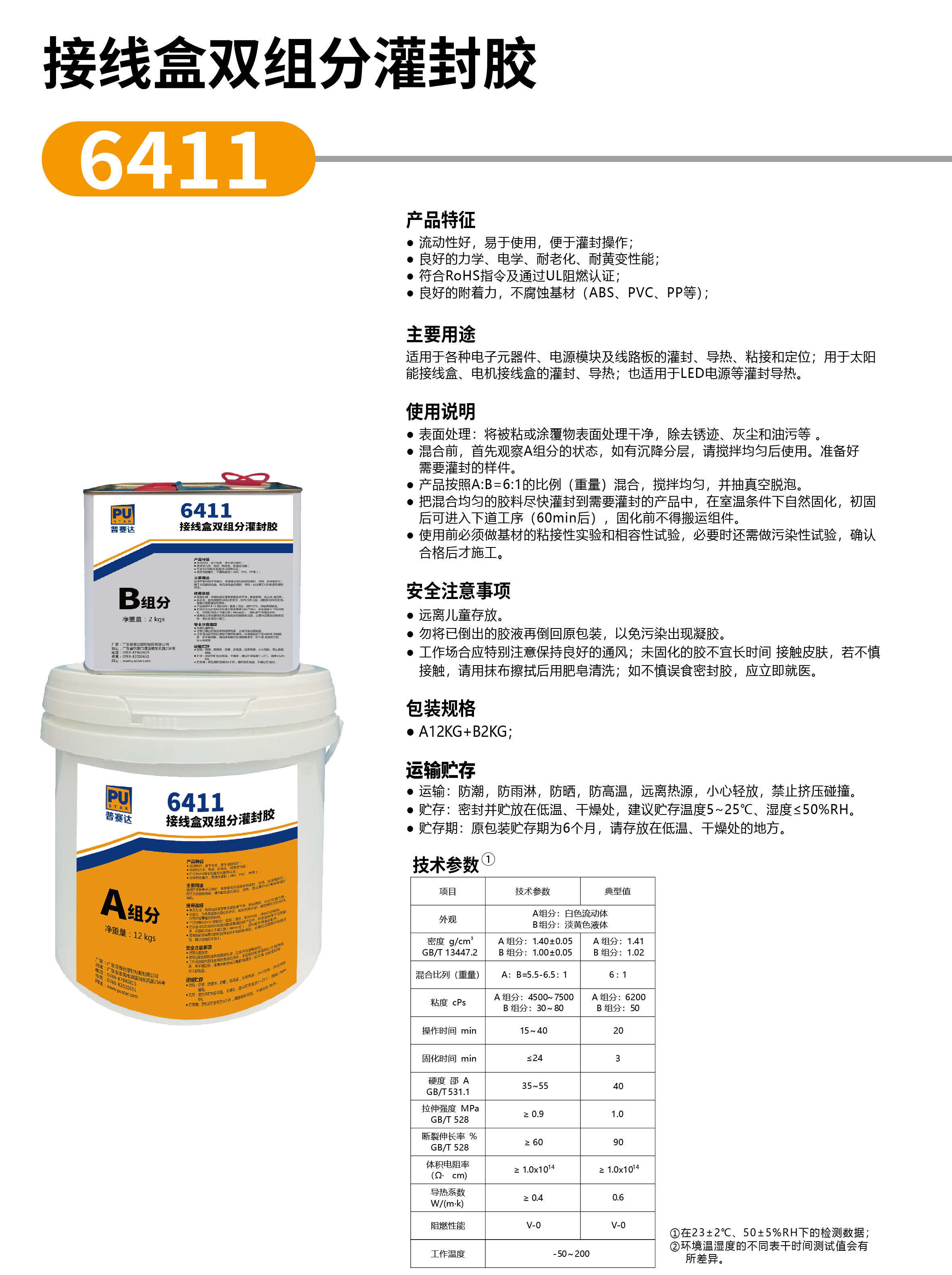 6411 是一種室溫固化的雙組分縮合型有機(jī)硅灌封膠,具備固化速度快、易流動(dòng)灌封、耐黃變、防水防潮、絕緣性能優(yōu)異、粘接基材廣泛等特點(diǎn),適合用于光伏接線盒、集成電路板、變壓器、防水電源等大面積粘合的密封件澆注和灌封。