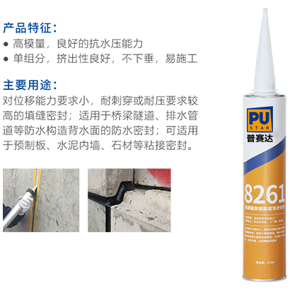 對(duì)位移能力要求小,耐刺穿或耐壓要求較高的填縫密封;適用于橋梁隧道、排水管道等防水構(gòu)造背水面的防水密封;可適用于預(yù)制板、水泥內(nèi)墻、石材等粘接密封。