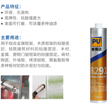 用于組合金屬框架、木質(zhì)框架的粘接密封,輕質(zhì)建筑材料的粘接固定,木材、金屬、塑鋼門窗框架的粘接固定。磚材、陶瓷、外墻板、烤漆鋁板、聚氨酯板等多種板材的防水密封與粘接。