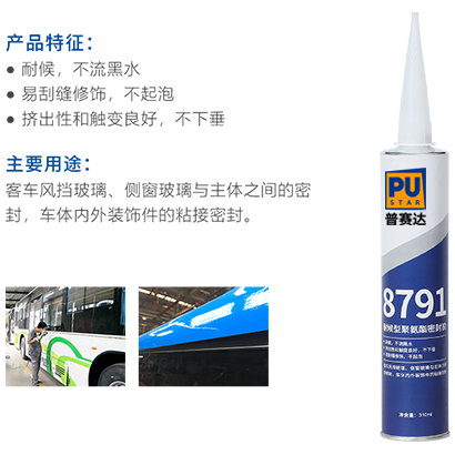 客車風(fēng)擋玻璃、側(cè)窗玻璃與主體之間的密封,車體內(nèi)外裝飾件的粘接密封。