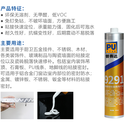 主要用于廚衛(wèi)五金掛件、不銹鋼、木材、各類裝飾件、玻璃制品與陶瓷墻面的粘接定位以及瓷磚脫落快速修補。包括室內(nèi)裝飾吊頂、石膏板、PU線條、地腳線的粘接密封??蛇m用于鋁合金門窗邊室內(nèi)部位的密封防水;金屬、鍍鋅板、不銹鋼、鈑金等材料的粘接密封。